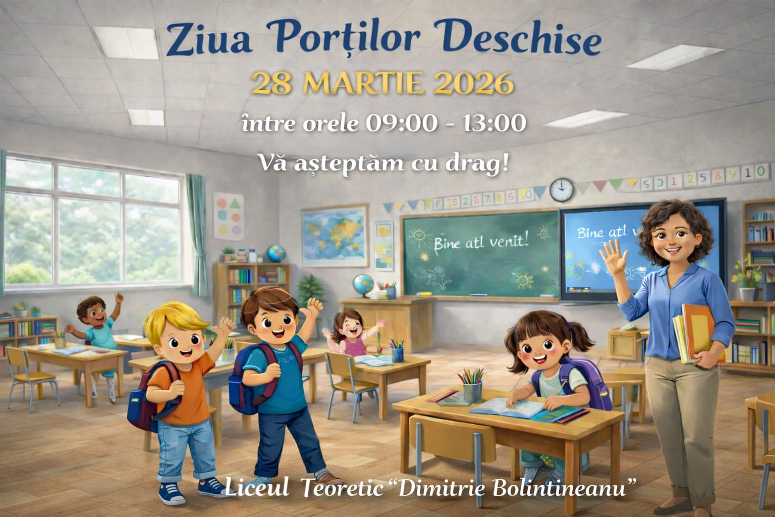 Sâmbătă, 28.03.2026, între orele 09.00 -13.00, Liceul Teoretic “Dimitrie Bolintineanu”, organizează “Ziua porților deschise”, zi în care sunt desfășurate activități pentru parinții și copiii interesați să viziteze spațiile destinate activităților la clasa pregătitoare.